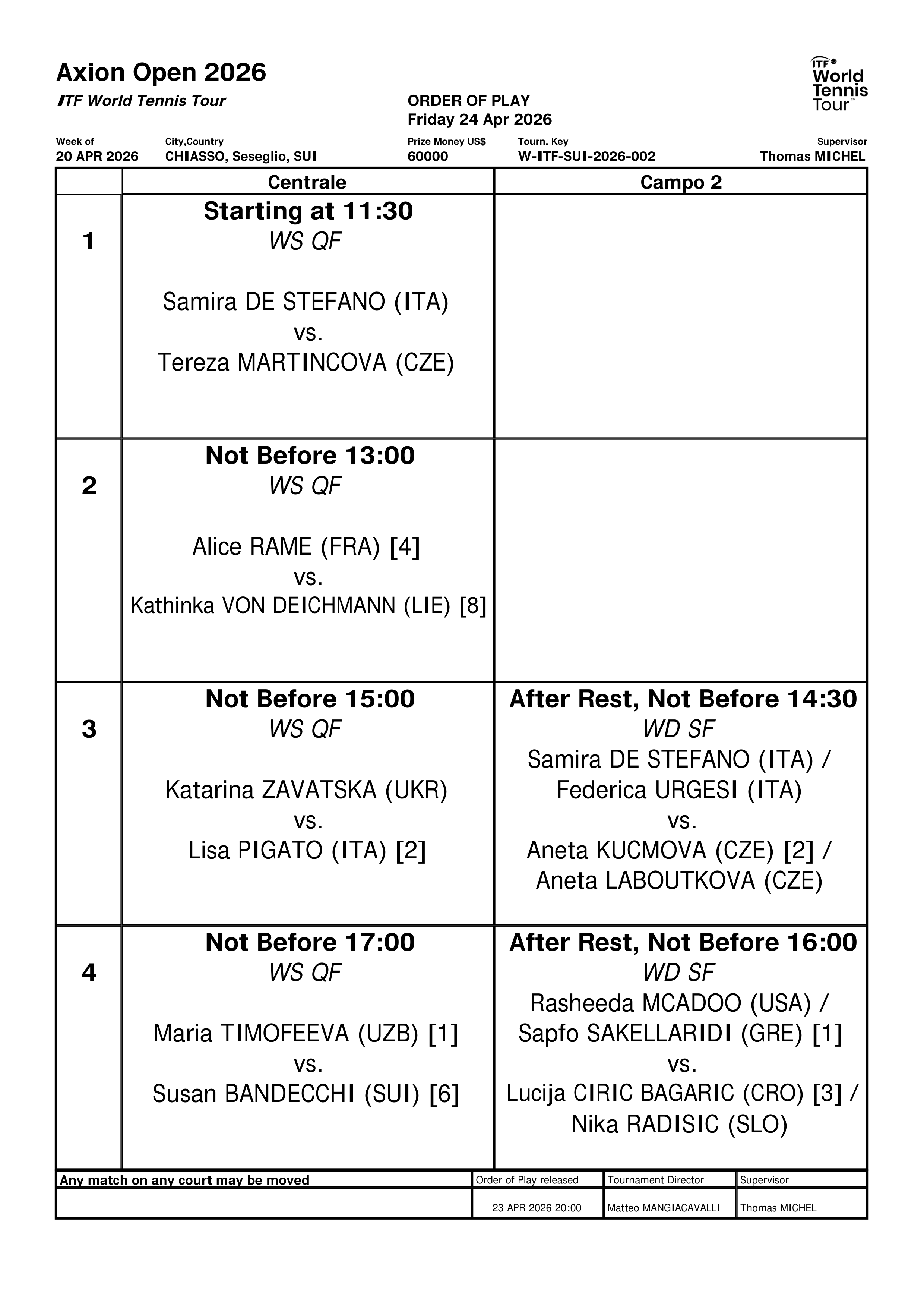 Su Campo 2, invece, il pomeriggio sarà dedicato al doppio. Non prima delle 14.30, dopo il riposo, Samira De Stefano/Federica Urgesi affronteranno Aneta Kucmova/Aneta Laboutkova [2]; non prima delle 16.00 sarà la volta di Rasheeda McAdoo/Sapfo Sakellaridi [1] contro Lucija Cîrîc Bagaric/Nika Radisic [3].
